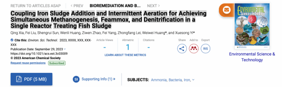 近日,生态与环境公司博士生夏晴、硕士生刘飞等在环境领域顶级期刊Environmental Science & Technology上发表了题为“Coupling Iron Sludge Addition and Intermittent Aeration for Achieving Simultaneous Methanogenesis, Feammox, and Denitrification in a Single Reactor Treating Fish Sludge”的研究论文(https://doi.org/10.1021/acs.est.3c03009)。