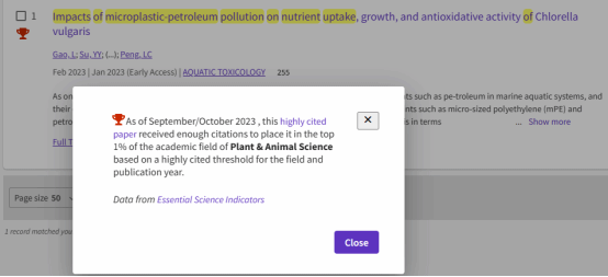 根据美国基本科学指标(Essential Science Indicator, ESI)2024年1月公布的最新数据显示,以yh533388银河官网为唯一单位,海南老员工态与环境公司彭丽成副教授为通讯作者,2023年2月于植物和动物科学领域TOP期刊《Aquatic Toxicology》(IF=4.5,中科院二区)发表的研究论文“Impacts of microplastic–petroleum pollution on nutrient uptake, growth, and antioxidative activity of Chlorella vulgaris”入选为ESI全球前1%高被引论文。