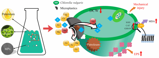 MPs-石油类对微藻的毒性及其关键影响因素示意图