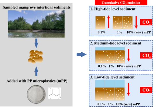 此外,该团队同步在Environmental Pollution(中科院二区TOP,IF2023=8.900)发表研究型论文,题为“Effects of polypropylene microplastics on carbon dioxide dynamics in intertidal mangrove sediments”,该论文的第一作者为2021级硕士生林栩冰,通讯作者为彭丽成副教授,yh533388银河官网为第一通讯作者单位。