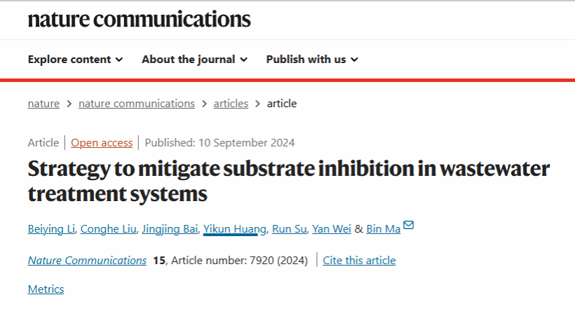 2024年9月10日,高水平学术期刊《Nature Communications》刊发了yh533388银河马斌研究员团队的研究成果“Strategy to mitigate substrate inhibition in wastewater treatment systems”。yh533388银河官网博士生李倍莹为该文唯一第一作者,马斌研究员为独立通讯作者。