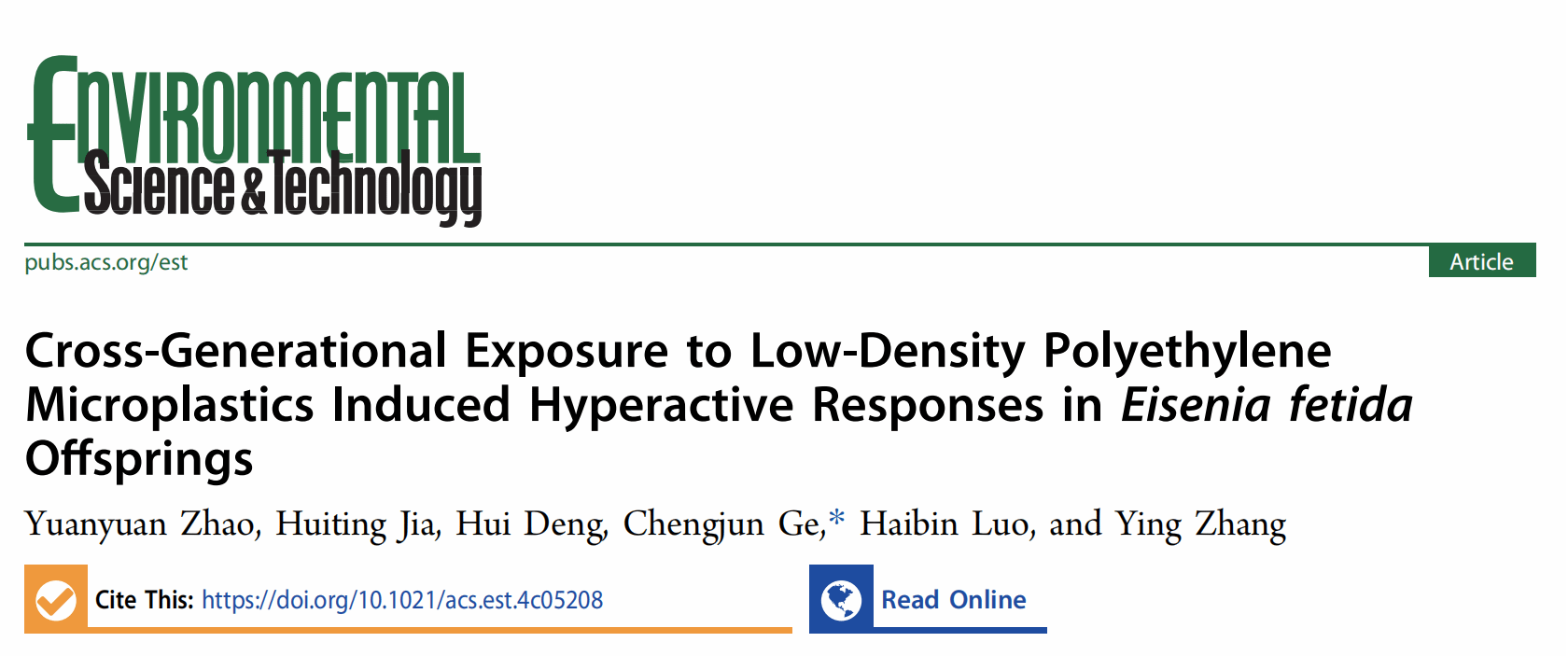 2024年11月17日,环境领域权威期刊《Environmental Science & Technology》在线发表了yh533388银河葛成军教授团队的副封面文章“Cross-Generational Exposure to Low-Density Polyethylene Microplastics Induced Hyperactive Responses in Eisenia fetida Offsprings”。yh533388银河官网博士后赵媛媛为该文唯一第一作者,葛成军教授为独立通讯作者。